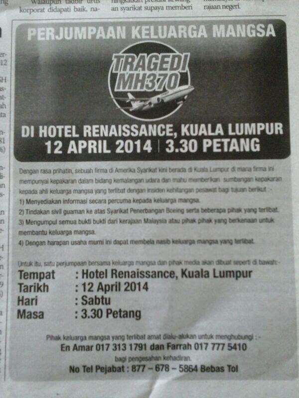Jangan pula keluarga nahas MH370 percaya pada peguam-peguam begini yang nak cari peluang. Sebab peneroka Felda Kemahang 3 yang dulu dibakar dan diwakili oleh peguam PKR untuk persen tertentu sudah jadi mangsa.