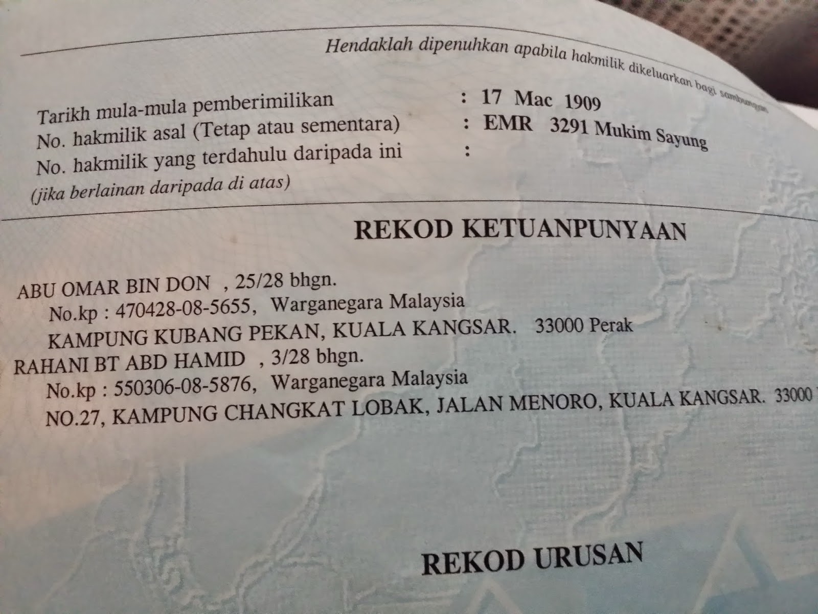 Tuan punya tanah bernama En. Abu Omar Bin Don telah bersetuju untuk menjual tanahnya seluas 1.343 hektar kepada maahad tahfiz dengan harga rm 250,000. Tanah di atas nama beliau dan isterinya Puan Rahani Binti Abdul Hamid.