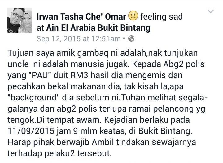 Berikutan tersebarnya gambar di atas ini, beberapa orang anggota Polis di Bukit Bintang telah dikecam hebat oleh natizen melalui media sosial di atas sikap mereka. Menurut saksi yang mengambil gambar ini, beliau menyalahkan "abang-abang Polis" di Bukit Bintang kononnya telah "POW" duit RM3 hasil dari mengemis lelaki ini.