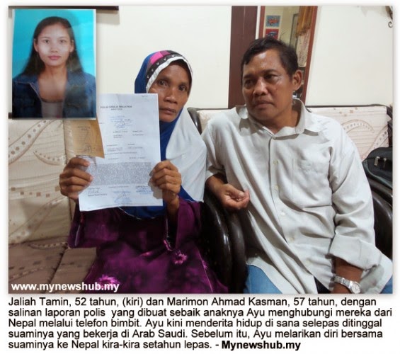 Warganegara Malaysia Lari Ikut Warga Nepal ‘Diberi’ Makan Khinzir Di Nepal![]() Seorang ibu muda pasti tidak terfikir apabila tindakannya melarikan diri ke Nepal mengikut suaminya akan menyebabkan hidupnya menderita sepanjang empat tahun di sana dan ketika kini dia mahu pulang ke Malaysia. Itulah derita yang kini dilalui oleh ibu muda warganegara Malaysia Nur Sri Rahayu Marimon, 24 tahun, yang kini tinggal di Nepal bersama dua anaknya selepas ditinggalkan suaminya yang bekerja di Arab Saudi sejak tiga tahun lepas. Dia yang dikenali sebagai Ayu kini terpaksa bekerja memecah batu di Nepal untuk menyara kedua-dua anaknya. Biarpun suaminya ada mengirimkan wang tetapi ia dibuat melalui ibu mertuanya yang memberikan wang tidak mencukupi kepadanya dan anak-anak. Lebih menyayat hati, cucunya yang berumur setahun dipaksa memakan bubur nasi yang dimasak bersama dengan daging khinzir. Jika si kecil enggan memakannya, ibu mertua Ayu akan memukul kanak-kanak itu. ![]() Kira-Kira setahun lepas, bapa Ayu seorang pemegang taraf penduduk tetap dari Indonesia sejak sembilan tahun lepas, Marimon Ahmad Kasman, 57 tahun, menerima panggilan daripada Ayu memaklumkan bahawa dia sebenarnya sudah berada di Nepal untuk tinggal bersama suaminya. Sebelum itu ketika tinggal di Malaysia, Ayu membawa diri bersama kedua-dua anaknya ke Nepal tanpa pengetahuan ayahnya. Ayu dan suaminya itu berkahwin sebelum itu di Thailand dan kemudiannya mendaftarkan perkahwinan itu di Malaysia dan anak pertama mereka lahir di Malaysia dan anak kedua pasangan itu dilahirkan di Nepal. Kini, Ayu merayu untuk dibawa pulang ke Malaysia kerana sudah tidak tertahan hidup dalam keadaan sebegitu sehingga terpaksa memakan babi apabila disuruh oleh ibu mertuanya. Marimon hadir bertemu dengan wartawan Mynewshub.my memaklumkan beliau telah menghubungi Wisma Putra untuk tujuan itu dan pihak Kementerian Luar sudah pun menghubungi kerajaan Nepal bertanyakan tentang keadaan anaknya. “Menurut pegawai di Kementerian Luar, tiada masalah untuk membawa Ayu pulang kerana lokasi tempat tinggalnya sudah dikenal pasti tetapi Ayu dikatakan sudah tinggal di Nepal melebihi tempoh masa yang dibenarkan tanpa visa. “Pegawai itu berkata denda kerana kesalahan Ayu itu sudah mencecah RM32,000 dan jumlah keseluruhan termasuk tiket pulang ialah kira-kira RM35,000,” katanya kepada Mynewshub.my. Marimon dan isterinya Jaliah Tamin, 52 tahun, seorang rakyat Malaysia tidak mampu untuk meraih wang sebanyak itu untuk membawa Ayu pulang ke Malaysia. Ayah Ayu, yang sebelum ini bekerja kerja-kerja buruh kini sudah menghidapi kencing manis dan sudah kurang bekerja untuk menyara keluarga. “Saya kalau hendak uruskan tambang balik tiada masalah, ini apabila dijelaskan termasuk denda mencecah jumlah sebegitu saya tidak mampu,” katanya. Kes ini sudah pun diserahkan kepada Biro Pengaduan Awam Kelab Putera 1 Malaysia yang dikelolakan oleh Ahli Parlimen Baling Datuk Abdul Azeez Abdul Rahim untuk tindakan lanjut membantu keluarga itu. Pihak biro ketika ini masih meyiasat kes berkenaan. Orang ramai juga jika mahu membantu Marimon boleh tampil untuk membantu membawa pulang Ayu ke Malaysia.