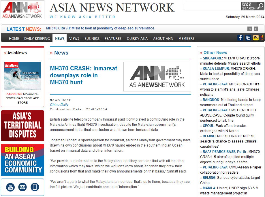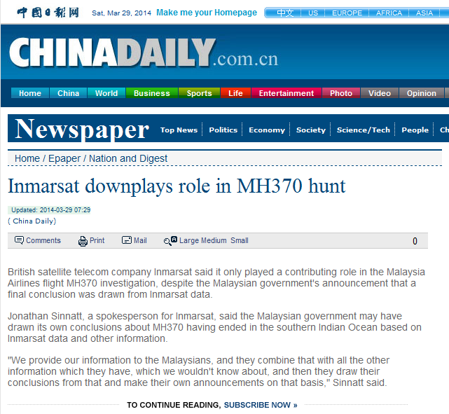 Pengumuman Najib yang mendakwa penerbangan MH370 telah berakhir di selatan Lautan Hindi itu telah menimbulkan kemarahan waris penumpang dari negara China. Selain itu bukan sahaja ianya tidak dipercayai oleh waris warga China, anak Kepten Zaharie dan Penganalisa Penerbangan juga tidak mempercayai apa yang Najib umumkan itu.. Bagaimanapun.. hari ini terbongkar keseluruh dunia.. apa yang Najib dedahkan dalam sidang media itu kononnya kesimpulan yang mengatakan 'MH370 berakhir di Lautan Hindi' itu datangnya dari Inmarsat adalah bohong semata-mata. Dalam satu laporan oleh China Daily, portal berita dari negara China itu telah mendedahkan Jurucakap Inmarsat Jonathan Sinnatt berkata Inmarsat hanya menyediakan maklumat dan terpulang kepada kerajaan Malaysia untuk membuat kesimpulan sendiri. "Kami menyediakan maklumat kita kepada rakyat Malaysia, dan mereka menggabungkannya dengan maklumat yang lain yang mereka ada, yang kita tidak tahu tentangnya, dan kemudian mereka membuat kesimpulan daripadanya dan membuat pengumuman mereka sendiri. "Kami tidak terbabit dengan apa yang Malaysia umumkan, itu terpulang kepada mereka, kerana mereka melihat gambaran penuh. Kami hanya menyumbang satu set maklumat," Laporan oleh ChinaDaily ini juga telah disiarkan oleh Asia News Network.. Kesimpulan dari apa yang dinyatakan oleh Jurucakap Inmarsat itu ialah mereka menafikan dakwaan Najib kononnya teori yang mengatakan MH370 berakhir di Lautan Hindi itu adalah teori mereka. |