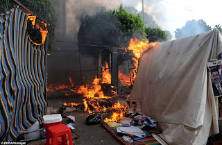![]() Kabur berapa ramai lagi rakyat Mesir yang tidak berdosa akan ditembak, dibakar atau dibunuh hidup-hidup kerana berjihad untuk menurunkan seorang lagi anak Firaun di Mesir, Abdul Fatah As Sisi yang kini sedang kemabukan darah agar turun dari kerusi kekuasaanya yang dicuri secara buruk dari Presiden Mohamad Morsi yang dilantik secara sah oleh rakyat menerusi pilihan raya. Pembunuhan dan angka kematian di negara benua Afrika itu kian bertambah bukan dari dari hari ke hari tetapi dari jam ke jam malahan minit ke minit. Asap dan api terus mengepul dan menyala di sana. Langit Kaherah sudag gelap pekat dengan asap kezaliman. Lubang kubur tentunya bertambah lebar, darah dan air mata juga kian membanjiri kota Kaherah itu. Dari sini kita tidak dapat menggambarkan apa yang berlaku sebenarnya. Hanya dengan melihat kiriman gambar yang dimuatkan dalam media sosial ataupun laporan rasmi agensi-agensi berita ia sudah menakutkan kita. Menggerikan. Menyaksikan mayat bergelampangan ada yang hangus dibakar penaka ikan kering, ditembak, kepala pecah bersembur otak atau tali perut terburai menyebabkan kita jadi tidak terkutik dan air mata mengalir tanpa disedari. Dari angka yang tidak rasmi angkara kemabukan anak Firaun baru si Abdul Fattah As Sisi itu khasnya dan pasukan tentera Mesir amnya sudah menghimpun lebih 2,500 mayat, manakala lebih 15,000 yang cedera. Mereka adalah merupakan rakyat yang bangkit mempertahankan Presiden kesayagan mereka Morsi yang ditahan kini masih dalam tahanan tentera entah di mana. Pastinya angka itu akan bertambah dan kesadisan demi kesadian terus berlaku. Tentera Mesir pimpinan anak Firaun baru itu bermaharajalela dan bermandikan darah. As Sisi kandati Islam tetapi jiwa dan roh Islamnya sudah hilang dirasuk syaitan atau pun jembalanag Abu Jahal, Abu Lahab atau manusia sesat dan pembunuh berketurunan. Apabila As Sisi menjadikan perkarangan masjid Raba'ah Adawiyah sebagai pusat pembantaian. apa lagi hendak dikonotasikan perbuatan itu kalau ia lebih kemaruk dan gila dari syaitan? Rasanya syaitan jauh lebih berhati perut sebab itulah ada orang mengatakan lebih baik berkawan dengan syiatan dikenali? Haha.. Abdul Fattah nampaknya tidak melalui jalan sukar bagi mempertahankan kedudukannya yang diperolehi secara haram dengan menjadikan rakyat sebagai mangsa. Beliau tidak dicabar oleh sesiapa, melainkan rakyat Mesir yang turun dengan suara, seruan Allahuakbar dengan mengangkat sepanduk pelbagai kata-kata kecaan dan kesalan tanpa senjata. Sedang dunia luar yang ada kuasa penegur seperti Amerika Syarikat atau Eropah diam membisu dan ketawa di hujung jendela menyaksikan pembunuhan sesama Islam. Apakah Amerika bersekongkol di sebalik tragedi yang berlaku di Kaherah kini? Tentu sekali. ![]() Mangsa kekejaman tentera Mesir. Saya tidak mahu menulis dan menebak lebih jauh dari itu. Sebelum ini pun saya mendiamkan tangan saya dari menulis tentang pergolakan dan pembunuhan di Mesir walaupun hati meronta-ronta kehibaan. Apa yang berlaku di Mesir daripada gambaran diterima ianya cukup memilukan. Mesir sudah mencatat satu sejarah huduh paling menggerikan di abad ini, yang melibatkan pembunuhan beramai-ramai. Mungkin apa yang berlaku di Mesir boleh dianggap sama kejam dengan apa yang berlaku di Bosnia kira-kira 15 tahun lalu. Ataupun pembakaran penyokong Mesir oleh tentera Dajal itu lebih sadis dengan tindakan pelampau agama Buddha di Myanmar yang membakar perkampungan orang Islam di sana. Kita tidak ada kudrat untuk mencegah apa yang sedang berlaku di Mesir. Kita hanya ada semangat dan peri simpati yang tinggi. Kalaupun kita menangis keluar air mata darah sebagai simpati, ia tidak akan menghentikan atau meredahkan otak manusia yang kini dalam kemabukan dan dihasut di Mesir itu. Apa yang kita di sini dapat lakukan hanya berdoa dan merintih sesama sendiri. Itu sahaja. Rintihan kita laksana punggung merindui bulan. Tetapi apa yang berlaku di Mesir itu ia tidak boleh dianggap sebagai satu takdir semata-mata sebaliknya harus dimanfaatkan lebih dari apa yang kita lakukan hari ini. Kira perlu mengambil iktibar terhadap apa yang berlaku itu untuk kebaikan masa depan kita uamat Islam di sini atau di mana-mana jua. Kita perlu senantiasa berwaspada dan ingat bahawa kedudukan kita sebagai Islam senantiasa dicemburu dan dibenci adakalanya sengaja direka punca untuk membantai kita. Sesiapa jua bangsa di dunia ini berada dalam persimpangan atau celah perebutan kuasa baik agama maupun ekonomi dan politik. Selagi manusia ada nafsu ada cita-cita dan tidak dapat menanggalkan pemanduan syaitan maka dunia senantiasa siap untuk bergolak dan manusia yang lemah akan menjadi mangsa. Suasana itu tidak akan terhindar ia tetap akan berlaku. Ia seperti roda pedati naik turun dan kita hanya menunggu giliran. Apa yang dapat diperlakukan ialah mempebesarkan lekaran roda petati kehidupan dan takdir itu agar ia lambat tiba kepada kita. ![]() Khemah penyokong Morsi dibakar. Kita juga jangan mudah mengira lantaran negara kita hari ini aman damai, memiliki khazanah dapat membantu rakyat, kita tidak menimbulkan kekhuatiran seperti apa yang berlaku di Mesir itu. Jangan. Kita tidak boleh bersangka di air tenang tiada buaya. Justeru kita perlu waspada memperkuatkan keimanan dan solidariti kita bagi menghindar apa yang berlaku di Mesir itu. Keadaan yang ada wajib dipertahankan. Tragedi yang berlaku di Mesir itu boleh dirumuskan kepada beberapa simpulan untuk dijadikan iktibar atau pun renungan dalam kita melayar kehidupan dalam sebuah masyarat maupun negara. a) Rakyat akan bangkit apabila mereka merasakan mereka diperlakukan dengan tidak adil dan dilayan dengan zalim. Mereka akan bangkit tanpa mengria risiko yang menimpa mereka, yang penting merasa merasa puas dengan tindakan dan jikalau matipun mereka akan menutup mata rapat, tanda puas. b) Pihak berkuasa juga perlu melihat kebangkitan rakyat itu sesuatu penentangan yang akan datang dengan sendirinya. Juteru pihak berkuasa (kerajaan) harus senantiasa melayani rakyat seadil-adilnya mng