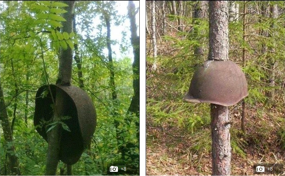 Senapan Mannlicher Carcano dibuat sekitar tahun 1891, telah tertanam dalam batang pohon yang tumbuh di hutan Rusia. Maxim gun ini dari tahun 1930-an mungkin digunakan selama Perang Dunia II yang berkecamuk di Eropa antara 1939 dan 1945 Bahkan hari ini, hampir tujuh dekade setelah Hari Kemenangan, masih mungkin untuk menemukan sebuah granat tua yang belum meledak seperti ini yang entah bagaimana menjadi bersarang di dalam pohon. Pohon ini adalah pohon muda kurus ketika helm ini mendarat di atasnya, mungkin dalam serunya baku tembak Menurut beberapa perkiraan, lebih dari 14 juta prajurit Soviet dan petugas tewas dalam Perang Patriotik Besar (Great Patriotic War) Beberapa gambar yang paling kuat dalam urutan menunjukkan pohon-pohon yang ramping tumbuh melalui lubang yang menganga di helm-helm Tentara Soviet. Bentuk dan kondisi alat pelindung itu menunjukkan bahwa helm-helm tersebut milik Tentara Merah selama Perang Dunia II. Mengingat bahwa masing-masing helm rusak berat, kemungkinan besar para pemiliknya telah mengalami akhir yang hebat. Sangat mungkin bahwa helm-helm tersebut tersandar di pohon muda selama pertempuran. Seiring waktu, pohon-pohon pun melebarkan lubang peluru pada helm, dan helm menjadi tertusuk. Alexander Ostapenko, penggemar sejarah militer Soviet dan Perang Dunia II dari Kolomna, Rusia, memostingkan beberapa foto di akun media sosial VKontakte nya. Mr Ostapenko mengungkapkan bahwa sebagian besar foto telah diambil di daerah Neva Bridgehead, yang dikenal sebagai Nevsky Pyatachok, yang merupakan situs dari salah satu kampanye yang paling penting selama Pengepungan Leningrad yang menghancurkan, yang berlangsung dari bulan September 1941 sampai bulan Mei 1943. Red Army kehilangan sekitar 260.000 prajurit saat berperang untuk membuka kembali jalur komunikasi darat yang telah terputus karena invasi dan pengepungan pasukan Jerman. Beberapa benda yang dipamerkan di "museum militer luar ruangan" ini termasuk pistol Maxim sekitar 1891; senapan Mannlicher Carcano sekitar tahun 1891, dan shell 75milimeter dari light field gun. Menurut beberapa perkiraan, Uni Soviet kehilangan sekitar 20 juta orang, baik militer maupun sipil , selama empat tahun antara tahun 1941 dan 1945. Setidaknya 14 juta nya adalah militer dari prajurit hingga perwira. Foto-foto pedih menangkap sisa-sisa Perang Dunia II yang ditelan oleh pohon-pohon dan memberi pesan kepada kita bahwa pada akhirnya, setelah semua medali diberikan kepada pahlawan dan semua perjanjian perdamaian ditandatangani, satu-satunya pemenang sejati adalah alam. Sebuah shell 75milimeter dari light field gun terbenamkan ke dalam pohon di suatu tempat di Rusia Sebuah sekop pencari ranjau dengan pisau logam berkarat yang terjepit erat dalam pohon dan gagang kayunya yang telah membusuk terlihat mencuat |