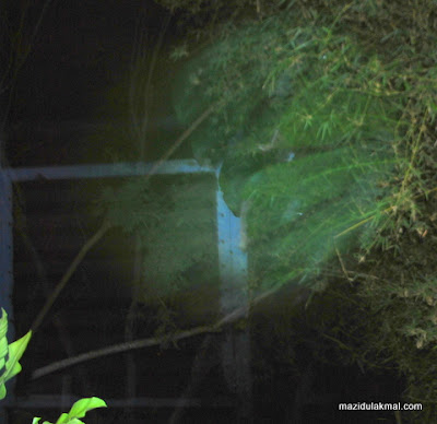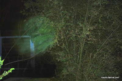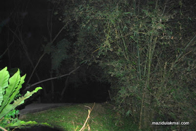 Gambar 'pintu' ke alam bunian dirakamkan? "Pernah kami datang dengan kawan ke sini, kemudian dia kena rasuk. Tiba-tiba tenaga dia menjadi kuat sangat dan dia hendak terjun ke dalam tasik. Nasib baik kami enam orang, pegang dia," ujar sumber. "Mula mula tadi, saya rakamkan gambar ini menggunakan kamera Nikon D60," kata Azree. "Abang tengok dua dahan kayu, v-shape di sebelah kiri rumpun buluh, tidak ada apa menarik. Lepas itu saya shoot lagi. Sebaik saya preview gambar, saya terkejut bang. Di tempat sama, macam ada frame pintu, kemudian kalau kita perhatikan secara teliti, macam ada entiti terbang keluar dari 'pintu' sama," terang Azree tenang. Berikut gambar yagng diambil menggunakan kamera Nikon D60 dimaksudkan oleh Azree dan sila klik imej untuk melihat butiran lebih jelas. Bandingkan gambar di atas dengan imej saya rakamkan pada jam 4.30 pagi tadi di lokasi sama dan teliti perbezaannya