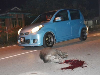 Akibatnya, mangsa tidak sempat mengelak dan terus melanggar haiwan itu sehingga dia jatuh dan tercampak ke atas jalan. Menurutnya, dia bernasib baik kerana kereta yang lalu di kawasan itu berjaya mengelak daripada melanggarnya. Mangsa hanya mengalami kecederaan ringan, manakala babi hutan itu mati serta-merta. |