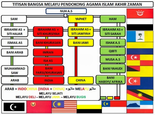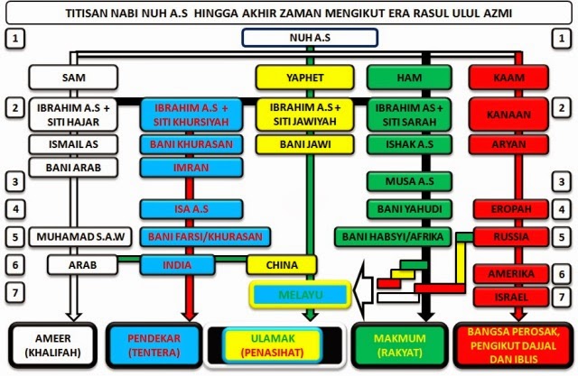 ![]() MELAYU PENEGAK PANJI HITAM DARI TIMUR Sabda Nabi SAW : Akan datang Panji-panji Hitam dari Timur, seolah-olah hati mereka bagaikan kepingan-kepingan besi. Sesiapa mendengar tentang mereka, hendaklah datang kepada mereka dan berbaiatlah kepada mereka, sekalipun keadaannya seperti merangkak di atas salji. (Al-Hafiz Abu Naim) ![]() ![]() Untuk menghuraikan mengapa Melayu dikatakan Penegak Panji Hitam Dari Timur maka kita perlu menghubung kaitkan fakta; 1. Bagaimana Cara dan Kaedah pemeliharaan Allah SWT keatas Agama Islam dari permulaan manusia iaitu Nabi Adam hinggalah keakhir zaman. Yangmana manusia adalah sebagai Pendokong Agama Islam. Inilah AMANAH yang di tanggung manusia yang mengangkat manusia sebagai Khalifah Allah di dunia. 2. Bagaimana Cara dan Kaedah Kesinambungan Agama Islam dapat dipelihara hingga ke akhir zaman. Firman Allah: “Hai manusia, sesungguhnya Kami menciptakan kamu dari seorang laki-laki dan seorang perempuan dan menjadikan kamu berbangsa - bangsa dan bersuku-suku (kaum) supaya kamu saling kenal-mengenal. Sesungguhnya orang yang paling mulia diantara kamu disisi Allah ialah orang yang paling taqwa diantara kamu. Sesungguhnya Allah Maha Mengetahui lagi Maha Mengenal”. (Al Hujurat 13) Ke 2-2 fakta ini jawabannya ialah manusia. Manusia yang menjadi alat sebagai Pendokong, Pemelihara dan Penyambung Agama Islam hingga ke akhir zaman. 1. Dari Nabi Adam dan Hawa - Diri/Manusia Pendokong Agama 2. Dari Nabi Idris dan segala keturunannya - Kaum Pendokong Agama 3. Dari Nabi Nuh dan segala keturunannya hingga sekarang - Bangsa Pendokong Agama. Hakikatnya semua manusia sebagai Pendokong Agama atau Penanggung Amanah Allah. Walaupun ada manusia yang engkar. Ini bukanlah persoalannya. Jawaban kepada yang engkar ialah Neraka iaitu diakhirat. Sebenarnya maksud dan matlamat Allah ciptakan manusia dari 1 diri dan berpasangan, berkembang biak menjadi Kaum/Suku Manusia dan akhirnya berkembang biak menjadi Bangsa Manusia adalah sebagai PENDOKONG AGAMA(AMANAH) ISLAM. Oleh itu, untuk memperkatakan dan membuktikan Bangsa Melayu sebagai Penegak Panji Hitam Dari Timur maka kita mesti memulakan bagaimana kitaran mula wujudnya Bangsa manusia di dunia untuk Allah menyusun dan membentuk bagi melahirkan Bangsa Melayu sebagai Bangsa Pendokong Agama dan Bangsa Penegak Panji Hitam Dari Timur. PERINGKAT KEWUJUDAN MANUSIA DI BUMI 1. Peringkat Permulaan 2. Peringkat Pertengahan 3. Peringkat Akhir 1. Peringkat Permulaan Kewujudan manusia di bumi, di mulai oleh Nabi Adam a.s dan Siti Hawa. Penghidupan mereka peringkat ini melalui hidup dan berumur panjang. Sehingga wujudnya Kisah Habil dan Qabil seperti yang dijelaskan di dalam Al Quran. Penghidupan peringkat permulaan ini disambung oleh Nabi Idris as. Nabi Idris a.s juga melalui penghidupan yang panjang. Tetapi oleh kerana panjangnya masa berjalan dan berkembang biaknya manusia di bumi maka penghidupan manusia sudah banyak yang lari dari Maksud dan Matlamat Hidup dibumi iaitu untuk Mengabdikan Diri kepada Allah SWT. Peringkat Permulaan kehidupan manusia diakhiri oleh Peristiwa Banjir Besar yang menenggelamkan bumi akibat dari kekufuran manusia terhadap Allah SWT. Kekufuran manusia ketika itu boleh dilihat dari kisah dan Sirah Nabi Nuh a.s. Sehingga dinyatakan bahawa Nabi Nuh a.s membuat Usaha Dakwah selama 900 tahun dan hasilnya beberapa kerat manusia sahaja yang Beriman dengan Nabi Nuh a.s. Semua kisah ini dijelaskan didalam Al Quran dalam Surah Nuh a.s dan Surah-surah lain. 2. Peringkat Pertengahan Peringkat Pertengahan manusia dimulai oleh umat Nabi Nuh a.s yang beriman. Setelah Nabi Nuh a.s melalui masa Dakwah yang terlalu panjang dan penghidupan manusia telah melewati batasan hamba, kekufuran manusia telah sampai kekemuncaknya. Maka bumi telah menjadi kotor untuk dihuni oleh manusia yang beriman dan makhluk yang sentiasa memuja-memuji Allah SWT. Oleh itu sebagai balasan dan cara untuk membersihkan bumi dari kekotoran hasil dari kekufuran manusia maka Allah SWT telah menurunkan bala dalam rupa banjir besar yang menenggelamkan keseluruhan bumi. Termasuklah gunung yang ditempatkan Bahtera Nabi Nuh a.s. Dinyatakan bahawa hanya 8 puncak gunung sahaja yang tidak tenggelam Dalam Nabi Nuh a.s membuat usaha Dakwah itu, Allah SWT telah memerintahkan Nabi Nuh a.s membina sebuah Bahtera atau Kapal di atas Gunung Judy. Dinyatakan bahawa sehingga saat-saat bumi ditenggelamkan, Nabi Nuh a.s terus berdakwah kepada umatnya, agar naik kebahtera. Tetapi inilah gambaran manusia yang kufur, tetap engkar dan keras hati. Sehingga orang yang terakhir Nabi Nuh a.s berdakwah adalah isteri dan seorang anaknya, yang tenggelam dan mati dalam banjir besar itu Bumi telah dicuci dan bersih dari manusia-manusia yang kufur kepada Allah SWT. Maka yang menjadi Kesinambungan Agama ialah manusia-manusia yang berada didalam Bahtera Nabi Nuh a.s. Dan manusia-manusia yang berada didalam Bahtera Nuh a.s jugalah yang menjadi Bapa dan Ibu yang mengembang biakkan zuriat, keturunan dan titisannya. Dan manusia-manusia inilah disebut sebagai Bapa dan Ibu Bangsa. Dari manusia-manusia inilah manusia yang ada sekarang dan sehingga bumi ini dikiamatkan oleh Allah SWT. Dinyatakan hanya seramai 82 makhluk termasuk Iblis dan isterinya saja yang selamat dan berada didalam bahtera Nabi Nuh as. Oleh itu Usul Manusia ialah dari Nabi Adam a.s dan Siti Hawa. Usul Kaum/Suku Manusia bermula dari Nabi Idris dan Usul Bangsa Manusia adalah bermula dari Nabi Nuh as. Maka hasil dari banjir ini jugalah untuk Allah mengembang biakkan manusia menjadi Bangsa. Seperti Firman Allah SWT ; “Kami jadikan kamu berbangsa-bangsa dan berkaum-kaum untuk kamu saling kenal mengenal antara kamu” Bila berlaku banjir besar, bumi telah menjadi kosong dari penghuninya iaitu manusia dan jin engkar. Tetapi kerja-kerja agama yang diletak dan diamanah pada bahu manusia tetap dan mesti diteruskan. Maka belayarlah Nabi Nuh a.s untuk menyambung usaha Dakwah selama 300 tahun lagi iaitu dengan menempatkan manusia-manusia yang selamat k