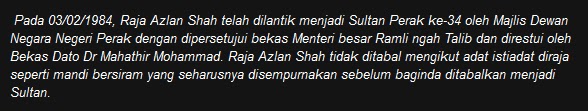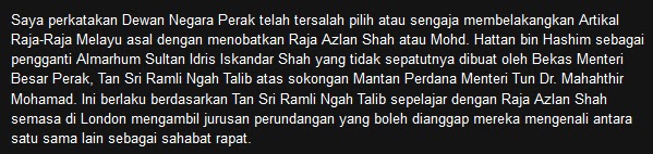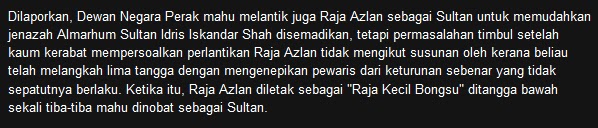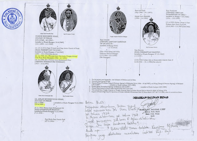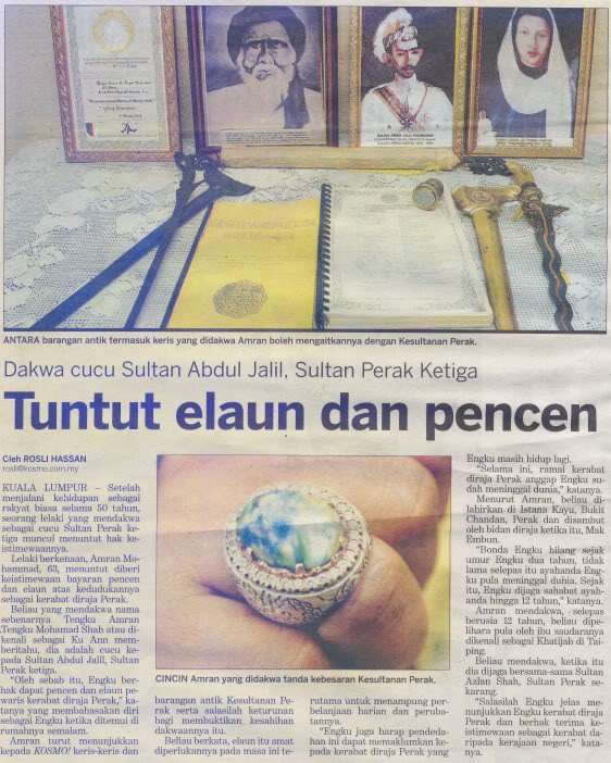 Di dalam siri Dinasti Azlan Shah, penulis telah menceritakan secara ringkas sistem pewarisan takhta Kesultanan Perak yang unik di blog entry Dinasti Azlan Shah dan seterusnya di dalam blog entry Dinasti Azlan Shah Bahagian II menceritakan mengenai perang saudara dan perebutan takhta Kesultanan Perak yang berlaku sejak beratus tahun dahulu. Kini, takhta Kesultanan Perak tidak sunyi daripada tuntutan oleh pihak-pihak yang mengaku sebagai waris yang lebih layak untuk menduduki takhta.![]() Sultan Melaka banyak menerima undangan rakyat Antara contoh yang diberikan di dalam kedua-dua blog entry sebelum ini ialah Raja Noor Jan Shah yang mendakwa keturunan Raja Abdul Rahman Ibni Sultan Ahmaddin (Sultan Perak ke-18) dan menuntut takhta Kesultanan Melaka. Raja Ahmad Nasir yang merupakan keturunan Raja Kulop Muhammad Kramat Ibni Sultan Muda Raja Ahmad pula mendakwa waris yang lebih layak menduduki takhta Kesultanan Perak adalah daripada keturunan Raja Kulop Muhammad Kramat yang merupakan abang kepada Sultan Idris Shah I (Sultan Perak ke-28), tetapi tidak dilantik menjadi Sultan. Dikatakan kerana merajuk maka diharamkan 7 keturunannya untuk menuntut takhta Kesultanan Perak. Turut didedahkan sebelum ini ialah mengenai kisah Sultan Ismail atau dikenali sebagai Marhum Sekudai (Sultan Perak ke-25) yang dilupakan. Cabang pewarisan takhtanya telah lama terhenti kerana menentang British. Walaupun sehingga hari ni waris Sultan Ismail hanya mendiamkan diri dan tiada yang menuntut takhta, tetapi mungkin suatu hari nanti mereka akan muncul untuk merancakkan siri perebutan takhta Kesultanan Perak. Uncleseekers III Baru-baru ini muncul pula sebuah blog yang diberikan nama Uncleseekers III dengan siri-siri Misteri Sultan Azlan Shah dan tuntutan takhta Kesultanan Perak oleh seorang individu yang bernama Tengku Amran Mohammad Shah (atau sesekali ditulis pula sebagai Raja Amran Mohammad Shah). Beliau mendakwa adalah merupakan cucu kepada Sultan Abdul Jalil Nasruddin Mukhtaram Shah Ibni Sultan Idris I dan Sharipah Malini. Kisah Tengku Amran Mohammad Shah ini pertama kali dibaca oleh penulis sekitar tahun 2006 di akhbar Kosmo dengan artikel bertajuk Dakwa cucu Sultan Abdul Jalil, Sultan Perak Ketiga – tuntut Elaun dan Pencen. ![]() Akhbar Kosmo bertarikh 10 Ogos 2006 Terdapat banyak tanda-tanya mengenai kisah Tengku Amran. Lebih menjadi tanda-tanya kerana tujuan utama kemunculan Tengku Amran adalah untuk menuntut elaun dan pencen. Soalan-soalan untuk Uncleseekers III dan Tengku Amran Mungkin Uncleseekers III dapat merungkai persoalan-persoalan berikut: ![]() Sultan Abdul Jalil 1. Mengapa Tengku Amran mengatakan Sultan Abdul Jalil Nasruddin Mukhtaram Shah adalah merupakan Sultan Perak ke-3? Bukankah Sultan Abdul Jalil merupakan Sultan Perak ke-29 yang menjadi Sultan dari tahun 1916-1918 mengantikan ayahandanya Sultan Idris Shah I? 2. Salasilah Kesultanan Perak menunjukkan Sultan Abdul Jalil pernah berkahwin sebanyak 4 kali di mana isteri-isteri baginda adalah: Tengku Permaisuri Yong Sofiah Binti Muhammad Yunus, Raja Perempuan Nuteh Jahrah Binti Sultan Ali (anakanda kepada Sultan Perak ke-24), Raja Mardhiah Binti Raja Kulop Muhammad Kramat (sepupu baginda iaitu anak kepada bapa saudaranya) dan Hajah Noriah. Mengikut catatan di dalam blog Uncleseekers III disebut, “Nama Ku Ann atau Tengku Amran Mohammad Shah disebut oleh beberapa orang Ahli Majlis, beliau adalah cucu tunggal kepada Sharipah Malini, Permaisuri Kedua kepada Sultan Abdul Jalil Nasiruddin Al-Mukhataram Shah (Iskandar Muda) selepas Permaisuri Pertama Tengku Yong Sapiah mangkat di Acheh.” Tiada disebut di dalam salasilah Sultan Abdul Jalil memperisterikan seorang wanita bernama Sharipah Malini. Mungkin Tengku Amran boleh menerangkan salasilah keluarganya di dalam satu post di blog Uncleseekers III, siapakah gerangan nendanya yang bernama Sharipah Malini serta siapakah ibu dan bapanya? Juga menjadi tanda-tanya apabila Tengku Amran mendakwa isteri pertama Sultan Abdul Jalil iaitu Tengku Permaisuri Yong Sofiah meninggal dunia di Acheh. Sejarah Kesultanan Perak menunjukkan Tengku Permaisuri meninggal dunia di Istana Negara Kuala Kangsar pada 8 Oktober 1917. 3. Diharap Uncleseekers III dan Tengku Amran dapat menerangkan mengapa gelaran nama beliau adalah “Tengku” dan bukan “Raja” seperti anak-anak raja Perak yang lain. Umum mengetahui gelaran “Tengku” (atau “Tunku” di Johor dan Kedah) digunakan oleh anak-anak raja dari negeri-negeri beraja yang berasal dari keturunan Bendahara, Temenggung dan pembesar lain seperti Pahang, Terengganu, Johor, Kelantan dan lain-lain. Sebagai contoh gelaran “Tun” yang merujuk kepada keturunan Bendahara Tun Habib Abdul Majid yang menjadi raja, nama gelaran keturunannya kemudian ditukar menjadi “Engku” dan “Tengku”. Begitu juga Kelantan dengan nama gelaran “Long” kemudiannya ditukar kepada “Engku” dan “Tengku”. Kebiasaannya hanya kerabat diraja Perak menggunakan nama gelaran“Raja”.Mohon pencerahan mengapa ingin dikenali sebagai Tengku Amran? 4. Petikan daripada artikel bertajuk Misteri Sultan Azlan Shah (1) bertarikh 7 September 2012, ![]() Dakwaan bahawa Raja Azlan Shah melangkah sebanyak 5 tangga bagi mengantikan Almarhum Sultan Idris sebagai Sultan Perak adalah tidak benar. Semasa Almarhum Sultan Idris mangkat pada tahun 1984, Raja Azlan Shah adalah merupakan Raja Muda Perak. Sila rujuk penerangan yang diberikan di dalam artikel Dinasti Azlan Shah. Ditunjukkan secara ringkas tangga-tangga Raja Bergelar yang dinaiki oleh Sultan Azlan Shah hingga bergelar Sultan Perak. ![]() Sultan Perak (Sultan Idris Shah II), Raja Muda (Raja Musa Ibni Sultan Abdul Aziz), Raja Dihilir (Raja Ekram Ibni Sultan Yusuf Izzudin), Raja Kechil Besar (Raja Lope Nur Rashid Ibni Raja Abdul Rahman Ibni Sultan Abdullah) Raja Kechil Sulung (Raja Ahmad Hisham Ibni Raja Abdul Malik Ibni Sultan Abdullah), Raja Kechil Tengah (Raja Azlan Shah), Raja Kechil Bongsu (Raja Izzuddin Ibni Sultan Idris Shah II) ![]() Gambar di 