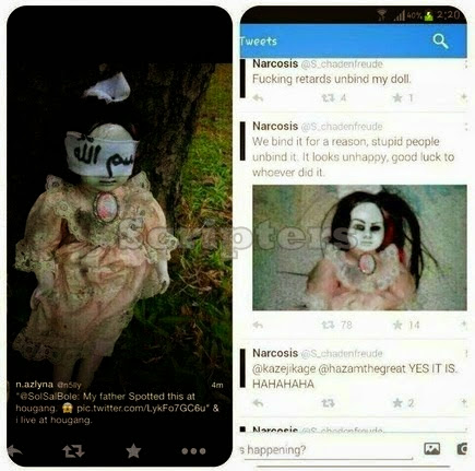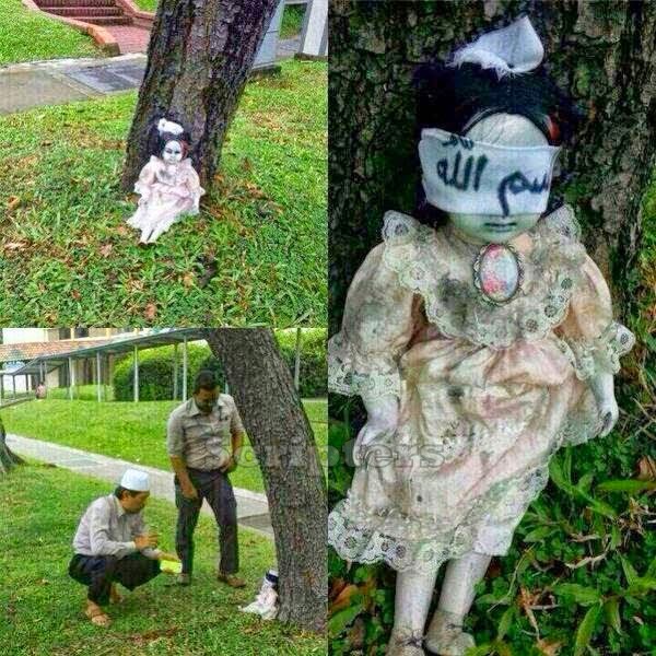 Singapura kecoh semalam apabila sebuah anak patung dengan mata di tutup dengan kain putih bertulisan ayat AL-Quran di jumpai diletakkan di tepi sebatang pokok di Hougang, Singapura. Apa yang menyeramkan, adalah wajah anak patung tersebut yang menyeram kan. Terdapat juga dakwaan anak patung tersebut bergerak gerak dengan sendirinya! Menurut beberapa pengguna di twitter patung itu adalah milik seorang yang di kenali sebagai Narcosis (@S_chadenfreude). Menurut Narcosis, anak patung itu adalah kiriman pos dari seseorang. Menurutnya lagi, anak patung itu bukan seperti anak patung biasa. ia sebenarnya berpuaka! Beliau juga menerangkan mengapa mata anak patung itu harus di tutup dengan kain. Ketika anak patung itu di jumpai di tepi pokok, seorang ustaz yang berpengalaman telah dipanggil untuk membantu. ![]() ![]() ![]() ![]()