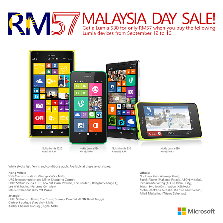 Sempena Hari Malaysia yang bakal tiba, Microsoft Malaysia telah mengumumkan satu promosi bagi telefon pintar Nokia Lumia 530 pada harga serendah RM 57!. Harga pasaran telefon pintar yang beroperasi menggunakan Windows 8.1 itu adalah RM 355. Tetapi ada syarat untuk mendapatkan telefon ini pada harga promosi. Syaratnya adalah, pelanggan harus membeli salah satu dari peranti Lumia yang terpilih. Peranti terpilih yang perlu dibeli oleh pelanggan adalah, Lumia 1520, Lumia 930, Lumia 630, dan Lumia 530. ![]()