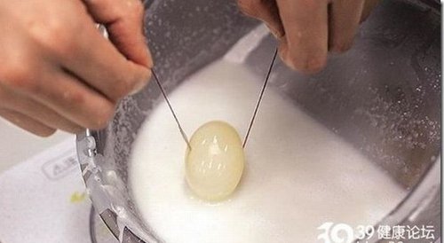 Put a sewing line through the “egg” and use it to dip the egg into liquid made of beeswax and calcium carbonate. Immerse and repeat several times, until a dry shell is formed then immerse it in cold water and pull the sewing line out. Now you put an “egg shell” coat on the “fake egg” and you are done.