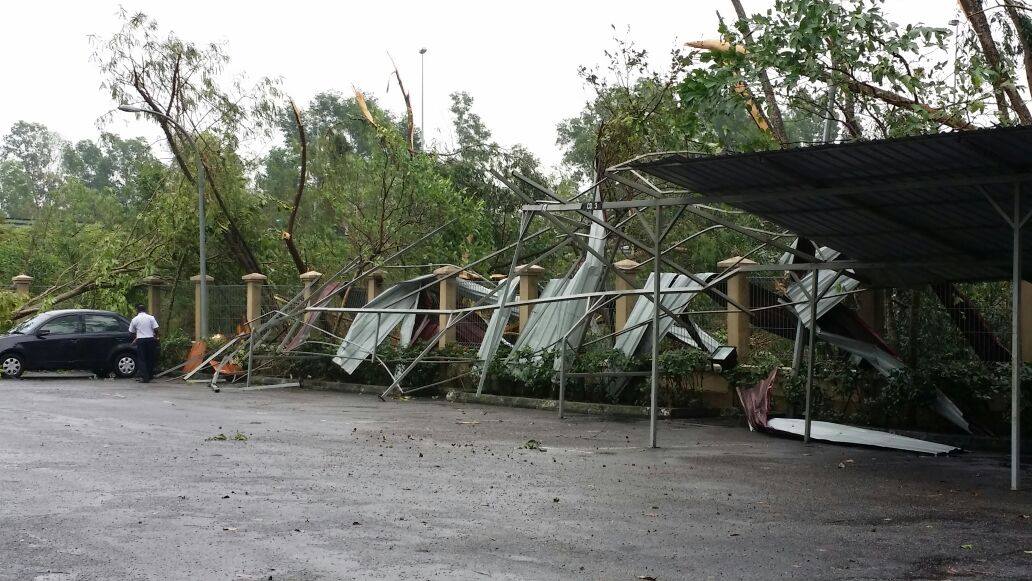 SHAH ALAM: Lebih 100 rumah rosak dengan atap gentingnya diterbangkan serta beberapa kereta turut dihempap pokok tumbang berikutan kejadian ribut kuat yang melanda sekitar bandar raya ini petang tadi. Laluan masuk ke kawasan perumahan yang terletak di Jalan Arca, Bukit Jelutong Timur terpaksa ditutup sementara waktu untuk operasi pembersihan apabila pokok-pokok di tepi jalan tumbang sehingga menutup laluan. Seorang pengawal keselamatan dari sekitar kawasan perumahan itu yang enggan mahu dikenali ketika ditemui pemberita berkata kejadian ribut disedari berlaku kira-kira pukul 2.10 petang ketika beliau berada di pos pengawal. "Hujan lebat terbentuk seperti satu puting beliung yang datang dari arah tepi pos pengawal sebelum bergerak ke kawasan perumahan itu dan menyebabkan atap genting tercabut dan pokok tumbang," katanya. Menurut seorang pemilik rumah dari Bukit Jelutong Muhammad Farid Abgani, 40, rumahnya dibanjiri air selepas atap genting tercabut ekoran ribut tersebut.