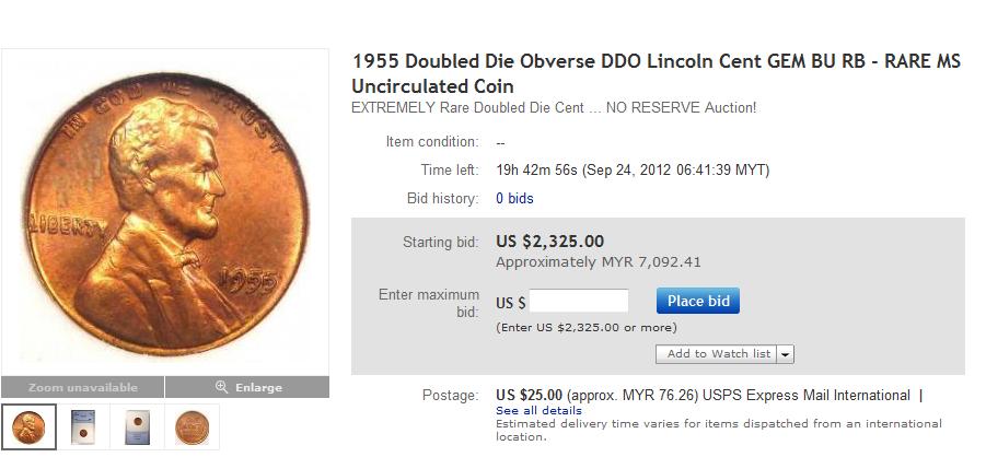 DDO 5 SEN 1977 DDR 1 SEN 1980 DDO 1 SEN 2004 DDO 10 SEN 2007 V1 DDO 10 SEN 2007 V2 DDO 10 SEN 2007 V3 DDO 5 SEN 2009 DDR 5 SEN 2008 DDO 50 SEN 1984 DDR 50 SEN 2009 DDR 20 SEN 2008 DDR 5 SEN 2009 DDR S3M 10 SEN 2012 (?) Antara koleksi syiling2 Malaysia Doubled Dies yg sempat depankanta kumpulkan.Tentu masih ada spesimen DD syiling Malaysia bagi ketiga2 siri yg masih belum dijumpai dan menunggu kita semua menyelongkar syiling yg ada dalam edaran Premium syiling error pertama Lincoln cent 1955 yg dikenali dgn nama "King of errors"ini pada tahun 1960 harganya dijual sekitar 1 USD sahaja sekeping....Hari ini ianya telah mencecah 3.000 USD sekeping..Lelongan terkini di Ebay telah dibuka dgn harga 2,325 USD atau RM7,092. |