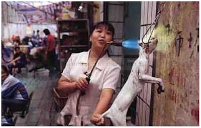 Oleh Fyruz Hanna Dikatakan orang Guangzhou di China minat sangat dengan daging kucing. Boleh dikatakan daging yang dibeli di pasar, semestinya ada daging kucing ini. Kalau dilihat pada beberapa gambar yang diterima, sebilangan orang di China gemar merebus masakan mereka dan tidak terkecuali daging kucing ini. Mereka mereneh untik dibuat sup. Pasti ramai yang telah mengetahui bahawa orang di China meminati daging kucing ini dan di media China juga telah tersebar luas cerita tentang makanan unik ini. . Proses memasak sup kucing itu boleh dilihat dari foto-fotonya. Sebenarnya foto-foto tersebut sudah lama disiarkan dan saya pun sempat mempostingnya beberapa bulan lalu. Tapi saat ini berita dan gambar tentang proses memasak sup kucing dengan cara merebus kucing hidup-hidup sudah semakin tersebar luas di berbagai website di China . Dan bukan tidak mungkin dalam masa yang singkat berita dan foto-foto itu akan menyebar lewat internet ke seluruh dunia. Ada pelbagai teknik yang digunakan untuk memasak daging kucing ini. Ada kucing yang dipukul sehingga mati atau direbus hidup-hidup. Mereka gemar memakan kucing kerana percaya daging kucing ini memberi khasiat kepada badan. Orang China yang percaya bahawa daging kucing ini mampu menyeimbangkan unsur ‘Yin’ dan ‘Yang’ dalam tubuh mereka. Mari kita lihat gamba-gambar di sekitar Ghongzhou dan China. Kenapa agaknya orang di China memakan daging kucing ya? Pasti ramai yang pelik. Ini kerana ketaksuban mereka dengan kesihatan, untuk umur panjang dan keseimbangan sehingga boleh dikatakan apa sahaja yang memberi kebaikan akan ditelan. Sebagai contoh orang di China gemar memakan janin bayi, tikus, anjing, monyet dan sebagainya. Apa kata kita lihat video ini: -CARI Infonet.