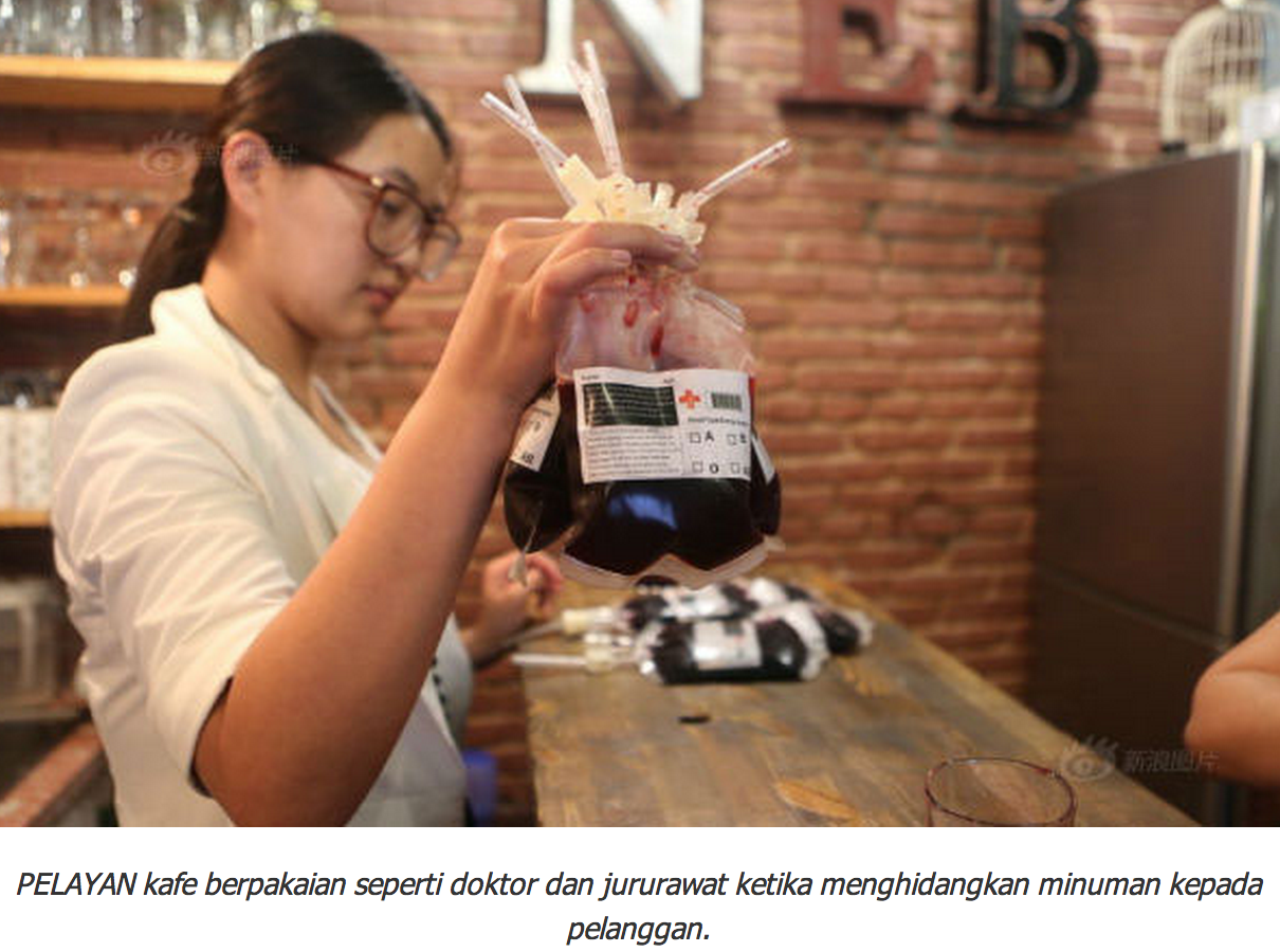 Menurut laporan media, pelayan di kafe berkenaan berpakaian seperti doktor dan jururawat dalam menyajikan minuman berwarna merah seperti wain merah, kola ceri dan jus anggur hitam di dalam yang direka menyerupai beg darah. Ia disajikan di dalam bilik dengan dinding batu-bata menyerupai bilik bawah tanah yang dihuni drakula, lengkap dengan sebuah keranda, buku dan muzik berkaitan pontianak bagi menaikkan suasana di kafe berkenaan. Minuman seperti kopi, air mineral dan jus buah yang mempunyai warna lain akan dimasukkan pewarna merah sebelum disajikan bersama beg khas berkenaan. Setiap beg berkenaan juga ditandakan dengan empat kumpulan darah, membolehkan pelanggan memeriksa ‘jenis darah’ mereka. Pembukaan kafe dengan tema pelik itu mendapat sambutan hangat dalam kalangan pengunjung.-Agensi sumber:kisahgempak.blogspot.com