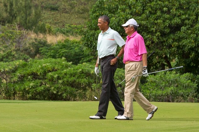 In Hawaii, Obama golfs with Malaysian Prime Minister Najib Razak President Obama, left, smiles at Malaysian Prime Minister Najib Razak as they play golf at Marine Corps Base Hawaii's Kaneohe Klipper Golf Course in Kaneohe, Hawaii on Dec. 24, 2014 (AP / Jacquelyn Martin) HONOLULU — President Obama has generally refrained from mixing business and pleasure on the golf course. On vacation here in Hawaii, he has mostly hit the links with the same circle of longtime friends and White House aides he usually pals around with. Until Wednesday, when a newbie joined the First Foursome — Malaysian Prime Minister Najib Razak. The White House said Najib, along with aides Joe Paulsen and Mike Brush, was playing with the president on the course at the Marine Corps base at Kanehoe Bay. Turns out Najib was in town on his own getaway, and it is not unprecedented for Obama to do a golf summit with a world leader. Last year in Hawaii, he played with New Zealand Prime Minister John Key. (In 2011, Obama famously played a round with House Speaker John A. Boehner at Andrews Air Force Base that did not exactly lead to a good working relationship off the course.)