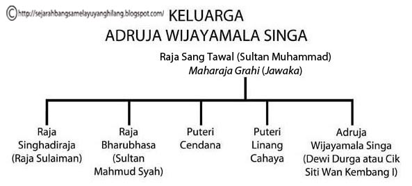 Lebih menarik lagi, Adruja merupakan keturunan Srimat Trailokyaraja Maulibhusana Warmadewa, Maharaja Srivijaya-Malayu (Palembang-Jambi) dari dinasti Mauli. Menurut manuskrip Sejarah Melayu (Sulalatus Salatin), nama sebenar maharaja tersebut ialah Demang Lebar Daun. Nama 'Adruja Wijayamala Singa' dikatakan berasal dari bahasa Sanskrit, di mana: