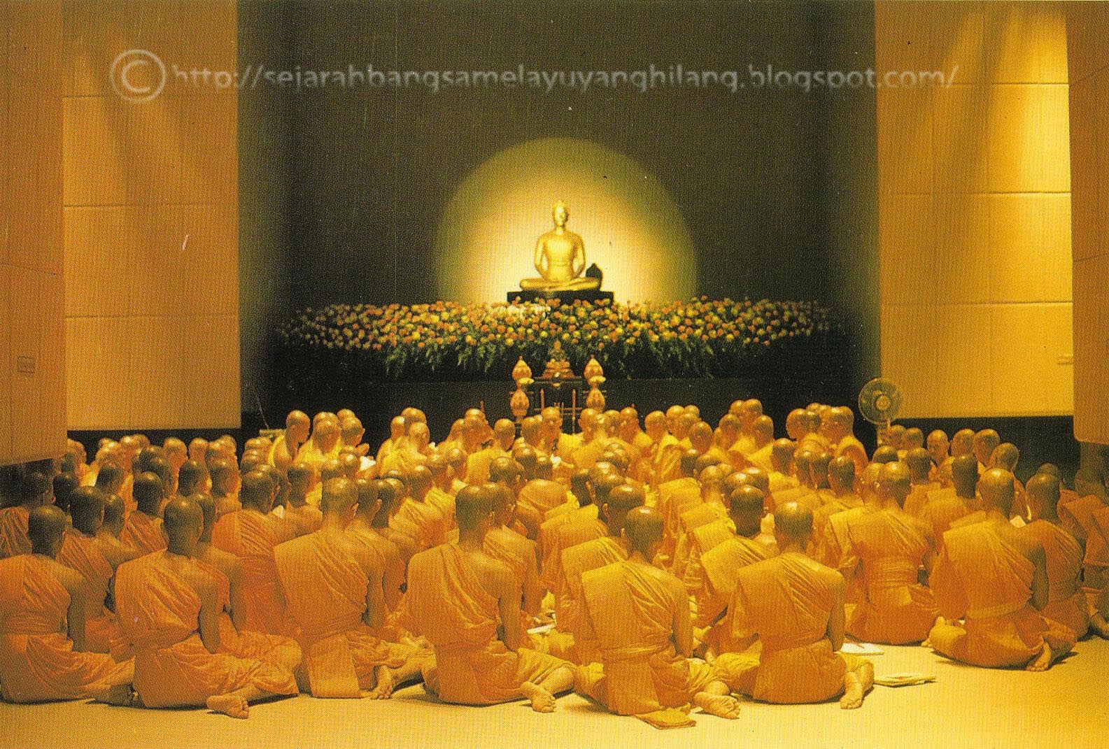 Sekumpulan sami Buddha Siam (Thai) sedangberdoa di dalam sebuah wat di Thailand. |