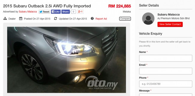 Subaru Outback 2015 telah muncul dalam oto.com.my – Harga jangkaan RM225k & bakal dilancarkan Rabu ini![]() Dijangka bakal dilancarkan pada Rabu ini, Subaru Outback 2015 telah pun diiklankan menerusi laman web klasified Oto.com.my. Walau pun tiada imej yang lebih jelas dan informasi terperinci mengenai model SUV ini, namun difahamkan harganya mungkin dalam lingkungan RM224,885.90. Ia dikatakan harga atas jalan termasuk insurans yang turut didatangkan dengan waranti selama lima tahun. Subaru Outback 2.5i AWD merupakan model import sepenuhnya (CBU) yang dijanakan oleh enjin 2.5 liter Boxer empat-silinder dengan sistem Subaru Symmetrical All-Wheel Drive. Antara elemen yang cuma tertera pada iklan tersebut ialah ia turut ditampilkan dengan Kawalan Dinamik Kenderaan dan juga rim aloi bersaiz 18-inci. Nak tahu info selanjutnya? Tunggu pelancarannya pada petang Rabu ini. kredit:www.infokereta.com
