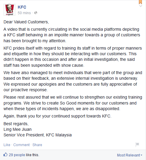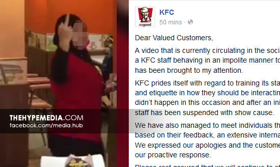 Video seorang pekerja wanita KFC menunjuk isyarat lu-cah tersebar di laman Facebook sejak 14 jam yang lalu dan telah mendapat 2,521 shares di laman berkenaan. Insiden terbabit berjaya dirakam oleh pelanggan premis makanan segera itu dan dimuat naik oleh laman Facebook komuniti Cina. Difahamkan, seramai 15 atau 20 orang pelajar sekolah berkunjung ke KFC Taman Putra untuk makan tengah hari. Oleh kerana jumlah mereka terlalu ramai, mereka mencadangkan agar kerusi dan meja digabungkan supaya mereka boleh duduk berdekatan masing-masing. Salah seorang dari pelajar terbabit meminta pekerja KFC berkenaan mengemaskan satu meja yang masih terdapat saki baki makanan pelanggan terdahulu agar mereka dapat mengabungkan meja seperti yang diinginkan. Namun, wanita itu tidak mengizinkan pelajar terbabit mengabungkan meja-meja itu atas sebab akan menghalang laluan serta akan menyebabkan pelanggan yang lain juga turut berbuat demikian. "Takkan dia nak biarkan kami duduk berasingan? 4 orang semeja?," kata pelajar terbabit. Mereka tetap mahu mengabungkan meja-meja tersebut dan tindakan mereka itu menyebabkan wanita itu berkata, "Lebih baik awak semua makan di luar,". Kata-katanya membuatkan para pelajar terbabit terkejut dan tidak menyangka mereka sebagai pelanggan diperlakukan seperti itu. "Patutkah dia berkata seperti itu kepada pelanggan? Bila diminta mengemaskan meja, muka masam mencuka dan nampak sangat tak selesa dengan kehadiran kami," luah pelajar berkenaan. Akan tetapi, para pelajar terbabit tidak berkecil hati dengan pekerja terbabit dan beranggapan mungkin wanita berkenaan tertekan dengan kerja atau hal lain. Keadaan bertambah buruk apabila wanita itu mula bertindak merakam gambar dan video mereka. "Kami dah mula rasa pelik. Dia pandang dan jeling ke arah kami. Dan semasa makan, tiba-tiba terdengar bunyi shutter click dari arah dia (pekerja KFC) yang sedang merakam gambar/video kami. "Kami hanya datang untuk makan, apa salah kami?," kata salah seorang pelajar berkenaan. Berasa dalam keadaan yang tidak selamat, salah seorang pelajar berkenaan juga turut mengeluarkan telefon bimbitnya merakam gambar/video wanita itu. Menyedari dirinya dirakam oleh pelajar berkenaan, wanita itu segera meninggalkan tempat itu dan menunjukkan isyarat lu-cah' terhadap sekumpulan pelajar itu. "Sikap biadabnya kami boleh terima. Tetapi menunjukkan isyarat lu-cah? Bagaimana KFC ambil pekerja mereka? Kami hanya pelajar sekolah, bukannya beli minuman berkarbonat dan lepak di KFC untuk 3 4 jam. Kami berbelanja untuk makan di sini," katanya yang juga mahu KFC mengambil tindakan terhadap pekerja terbabit. - THEHYPEMEDIA.COM Sumber