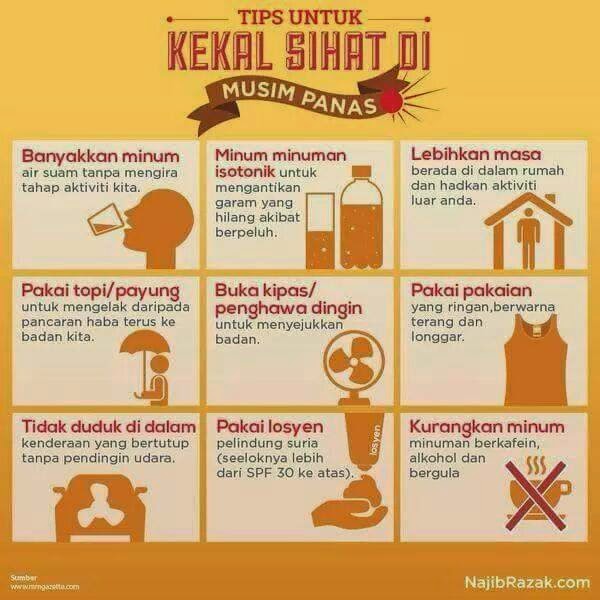 sumber foto : Lebih-lebih lagi, jabatan kajicuaca turut mengatakan keadaan cuaca yang panas macam ini akan dikekalkan sehingga awal bulan September, kenyataan tersebut mengundang kegusaran masyarakat umum. Berdepan cuaca yang panas, selain tidak dapat tidur, kehidupan dan rutin harian sedikit sebanyak terganggu kerana keadaan sebegitu mudah membuatkan kita rasa tidak bermaya. Namun, masih perlu diingatkan ketika cuaca panas, beberapa perkara yang harus diberi perhatian… Yang Harus Dilakukan Ketika Cuaca Panas : 1) Guna Bahan Pelindung Matahari Pancaran cahaya matahari yang panas sememangnya boleh mencederakan diri kita. Oleh itu, apabila keluar dari rumah, selain guna payung dan topi, jangan lupa menyapu bahan jagaan kulit yang berfungsi untuk melindungi kita dari bahang cahaya matahari. Tambahan lagi, apabila keluar dari rumah, adalah leih baik memakai baju yang longgar dan berwarna pudar. 2) Sentiasa Membawa Bersama Sebotol Air Cuaca panas, mudah berpeluh, badan biasa kekurangan air, oleh itu perlu minum banyak air untuk menambah kandungan air dalam badan. Kita juga boleh menambah kandungan air melalui makan bubur dan sup untuk memastikan tahap kehilangan air dalam badan dapat diminimakan demi meningkatkan kecerdasan seseorang itu. 3. Minum Lebih Air Teh Panas Mungkin anda akan kata hilang akal ke cuaca panas suruh minum teh panas. Tetapi menurut kajian yang dilakukan oleh pakar selidik Universiti Ottawa, Kanada, pada tahun 2012 mendapati suhu panas yang terkumpul dalam badan ketika minum minuman panas sebenarnya kurang daripada semasa kita minum air sejuk. 4. Banyakkan Makan Buah-buahan Segar Dan Bahan Buatan Kacang Soya Cuaca panas boleh menyebabkan selera makan menurun, maka lebihkan makan buah-buahan dan sayuran, bukan sahaja boleh menghilngkan kepanasan malah juga boleh menambah lagi kandungan fiber daripada makanan. 5. Membasahkan Pergelangan Tangan Dengan Air Paip Anda boleh selang beberapa jam guna air paip membasahkan pergelangan tangan selama 5 saat, ini kerana pergelangan tangan merupakan bahagian aliran nadi, dengan berbuat demikian mampu menurunkan kadar suhu darah. 6. Cuti Sementara Untuk Mengelakkan Diri Dari Cuaca Panas. Selain berada di rumah dengan memasangkan hawa dingin atau bersiar-siar di pusat membeli belah untuk mendapatkan suasana yang sejuk, sebenarnya boleh juga memilih bercuti di tempat yang berkedudukan tinggi, kawasan air terjun, taman tema berair atau kolam berenang, selain meghilangkan rasa panas, juga boleh merehatkan diri buat sementara waktu. Yang Dilarang Ketika Cuaca Panas : 1) Minum Bir Yang Berlebihan Cuaca panas, kalau dapat minum sebotol bir yang sejuk memang sesuatu perkara yang amat menyegarkan buat sesetengah orang. Tetapi perlu diingat juga alkohol yang terkandung dalam bir mudah membuatkan seseorang itu cepat rasa ingin buang air kecil, jadi kandungan air dalam badan akan banyak dan cepat dikeluarkan. Di samping itu, alkohol turut mengakibatkan saluran darah berkembang besar sehinggakan seseorang itu lebih merasai kepanasan. 2) Melakukan Senaman Yang Keterlaluan Cuaca panas, jangan melakukan senaman yang keterlaluan, tindakan sedemikian boleh membebankan badan. Kalau kebiasaannya berjogging selama 30 minit, maka buat masa sekarang rasanya adalah lebih baik kurangkan tempoh berjogging menjadi 20 minit. Ini kerana bersenam dalam keadaan cuaca yang panas, badan akan berada dalam situasi metabolik yang tinggi. Berjogging dalam keadaan cuaca yang panas selama 20 minit, mungkin akan menghabiskan tenaga haba yang biasanya dihabiskan ketika berjogging dalam masa 30 minit. 3) Makan Makanan Berminyak Dan Dibakar Tidak kira sama ada yang pedas, yang dibakar dan digoreng atau makanan lain yang berperisa tinggi, semuanya harus dikurangkan. makan, kerana boleh merangsang perut,terlebih makan mudah diserang demam, sakit kerongkong. 4) Berhati-hati Makan Makanan Berais Dan Mentah. Ketika cuaca panas, ramai akan makan makanan seperti ais cream yang dapat menyejukkan badan, tapi pendapat itu adalah salah kerana cuaca panas, badan mudah diserang kepanasan dalaman, kesan ini membolehkan fungsi penghadaman usus kita terjejas. Kalau makan lagi bahan yang sejuk dan mentah, ia boleh merosakkan organ usus dalam perut. Ketika cuaca panas adalah digalakkan makan makanan yang kurang perisa dan panas bagi menambahkan daya ketahanan. - CARI Infonet |