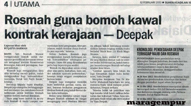 Deepak Jaikishan yang baik dengan Isteri Perdana Menteri Malaysia mendakwa Rosmah menggunakan bomoh untuk menguasai kerajaan termasuk mengawal kontrak Kementerian Kewangan. Selain itu, Rosmah juga menggunakan sihir menundukkan suaminya Datuk Seri Najib Tun Razak. Memetik laporan KeadilanDaily, Deepak juga mengakui menguruskan perkhidmatan bomoh tersebut daripada menyediakan hotel, tiket perjalanan serta pembayaran bomoh terbabit.
