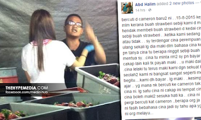 Berikut kata-katanya panjang lebar: Aku bercuti ke Cameron baru-baru ini. 15 Ogos 2015, kejadian berlaku di tapak pasar malam kerana buah strawberi sebiji, kami dimaki hamun oleh Cina ini. Ketika hendak membeli buah strawberi di kedai Cina ini, mak mentua saya merasa sebiji buah strawberi. Ketika kami sedang berbincang sama ada nak beli atau tidak, saya terdengar perempuan Cina itu maki hamun dalam bahasa mandarin. Saya pun bertanya kepada Cina itu, berapa ringgit sebiji buah strawberi yang dirasa oleh mak mentua saya. Cina itu meminta RM2.00. Saya pun bayar seperti yang diminta, kemudian saya kata, "Lain kali tak payah maki. You maki dalam bahasa mandarin, saya faham,". Lelaki Cina itu terus memaki hamun kami dengan sekuat hati sampai semua orang dengar seolah-olah kami ini bangsat sangat seperti pencuri. Patutkah lelaki itu buat begitu? Kami sudah bayar, kena maki lagi. Kesimpulannya, Cina ini memang kurang ajar. Yang mana nak bercuti ke Cameron, tak payahlah beli buah strawberi dari Cina ini. Lagi satu, Cina ini cakap, ini tempat Cina. Jadi, kalau tempat Cina, orang Cina boleh maki hamun sesuka hati ka? Cina ini kena ingat, kalau orang Melayu tak pergi bercuti di Cameron, berapa orang saja orang Cina nak pergi ke sana? Mujurlah saya ini fasih berbahasa Cina. Jadi saya tahu apa yang mereka maki atau kata pada kita orang Melayu. - Abd Halim Nasib tidak menyebelahi kedai tersebut apabila Abd Halim yang faham serta fasih berbahasa Cina. Sempena Bulan Kemerdekaan ini, semoga kita lebih prihatin dan kenal jiwa masing-masing agar hidup lebih harmoni dan sejahtera. Amalkan sikap hormat menghormati serta saling maaf-memaafi. Jadikan kisah buat strawberi ini sebagai pedoman buat kita di masa hadapan. -CARI Infonet.