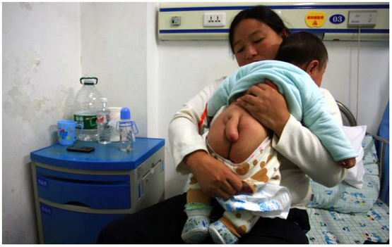 Changsha, China - Bayi lelaki berusia lima bulan ditumbuhi ekor sepanjang 5 inci dibelakang tubuhnya. Nuo Nuo dilahirkan dengan spina bifida, kecacatan tulang belakang yang jarang berlaku yang pembentukan jurang di tulang belakang. ![]()