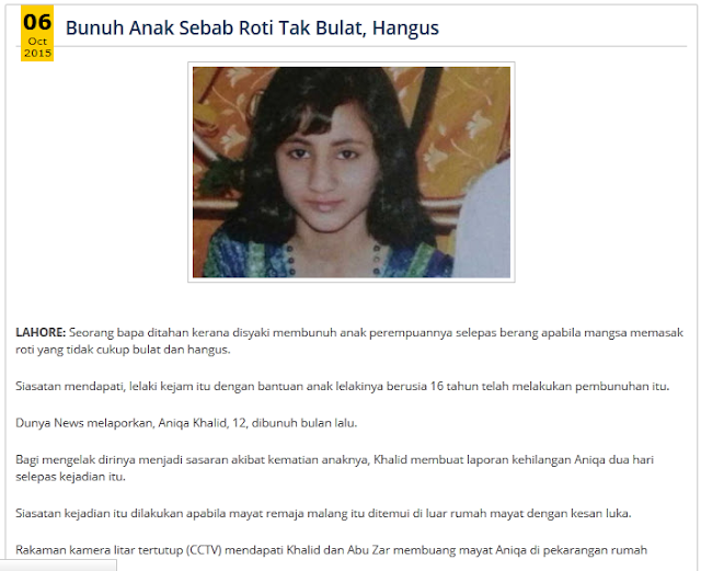 Lagi kes anak mati dibunuh oleh ayahnya sendiri. Di Lahore, Pakistan seorang lelaki disyaki membunuh anak perempuannya, Aniqa Kahlid kerana mangsa tidak menyediakan roti secukup bulat seperti yang dimahukannya.