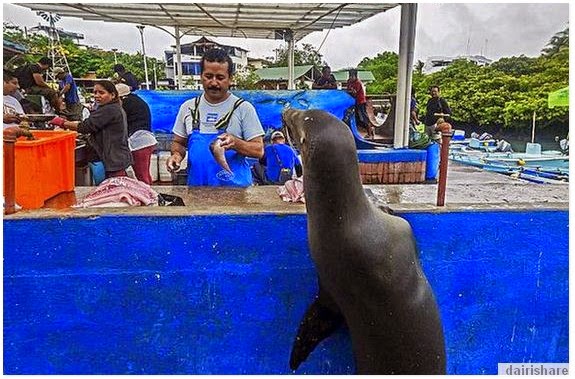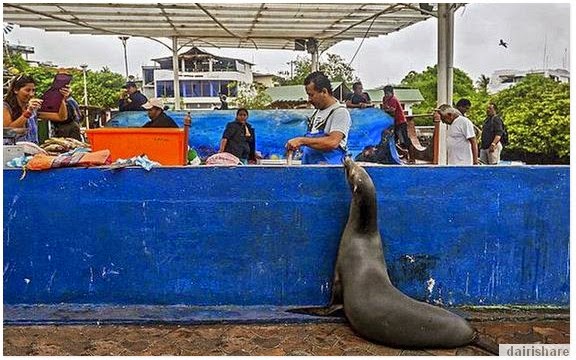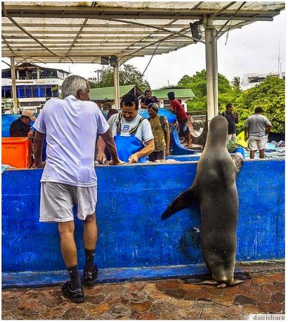 Kalau binatang ini beratur menunggu giliran pastinya akan tergamam dan terpegun lah mata-mata yang datang membeli. Namun, oleh kerana ia berlaku di Santa Cruz Island iaitu kawasan yang biasa untuk haiwan liar sebegini, pemandangan yang anda saksikan ini sebenarnya biasa sahaja . Bayangkan singa laut boleh sabar menunggu giliran untuk ikan segar. Apa pun sememangnya singa laut ini comel. -CARI Infonet. sumber: Dairishare
