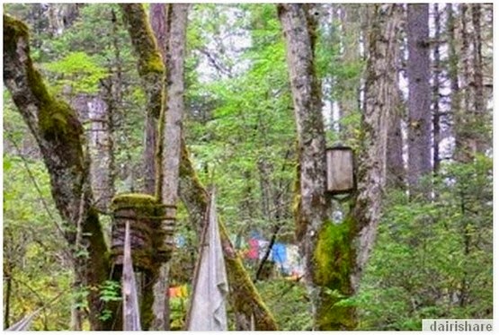 Tradisi yang diamalkan di perkampunyan Nyingchi di Kangbei, Tibet ini tak lain adalah satu amalan kuno yang masih lagi tidak dilupakan oleh kaum mereka. Amalan khusus untuk kanak-kanak ini dipercayai memudahkan mereka teruk naik ke syurga apabila diikat di atas pokok. Kanak-kanak berusia 13 tahun dan ke bawah yang mati akan dimandikan dengan air bergaram sebelum diletakkan didalam keranda dan di naik ke atas pokok.