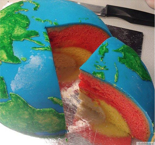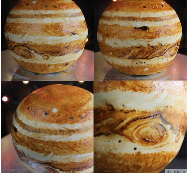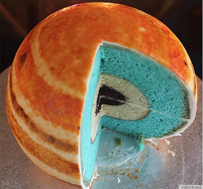 Namun bagi Chef Otodidak Rhiannon dari Cakecrumbs dilihat lebih berminat gambaran di ruang angkasa lepas yang luas dan penuh dengan misteri. Justeru beliau mendapat ilham menghasilkan siri kek berbentuk planet yang dirancang secara ilmiah dan tepat dengan pelbagai jenis kuih yang mewakili pelbagai lapisan pada planet Bumi dan Musytari. Untuk Kek Jupiter pusat nya adalah batuan (mudcake), diikuti oleh lapisan hidrogen metalik cair (mentega badam), dan molekul hidrogen cair (vanili berwarna). Untuk Bumi, yang dibuat mirip dengan dengan bentuk bumi lengkap dengan benua, Samudara dan lapisan bumi. Jelas, hasil kerja Chef Otodidak Rhiannon bukan sahaja boleh dijadikan sebagai bahan sajian malah sambil itu boleh dijadikan bahan pengajaran buat kanak-kanak. Berikut adalah paparan gambar yang jelas memperlihatkan hasil kerja yang memang teliti dan memerlukan kesabaran yang tinggi. |