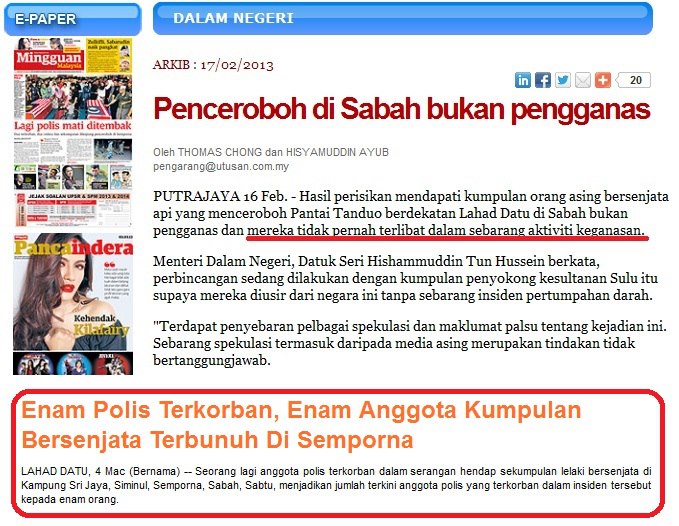 "Ini semua bagi memperkukuh pertahanan di ESScom," katanya dalam sidang media selepas Majlis Perjumpaan Bersama Warga Angkatan Tentera Malaysia (ATM) di Kem Penrissen. Tambah Hishammuddin, pihaknya telah menggerakkan kereta perisai 8x8 ke Tawau, mengerakkan jet pejuang Hawks ke Labuan serta Sabah yang akan memiliki satu batalion baharu. "Apa yang kita letakkan di Sabah akan juga merangkumi keselamatan di Sarawak dan termasuk Brunei kerana Ke bawah Duli (Sultan Hassanal Bokiah) telah kurniakan kepada kita empat buah helikopter Blackhawk. Blackhawk ini akan dilengkapi dengan 'gatling gun' dan peluru berpandu," katanya. - CARI Infonet. Sumber - Bernama |