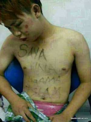 ![]() Semua pakaian dilarikan oleh suspek. Badannya diconteng oleh suspek kerana dia mengaku menghina orang Islam dan Melayu di laman sosial facebook dan Twitter. Mangsa dilaporkan tidak membuat laporan polis kerana bimbang kegiatannya terbongkar. Laporan polis hanya dibuat oleh penunggang motosikal menemui mangsa di lokasi.