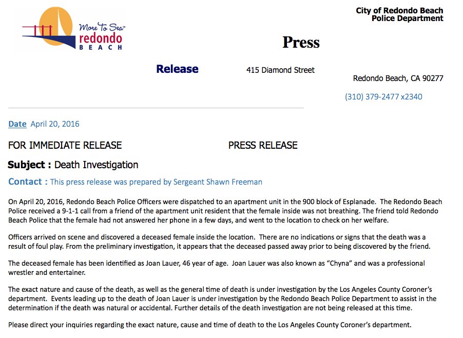 "Dengan rasa sedih yang mendalam, dimaklumkan kepada anda hari ini bahawa kita telah kehilangan ikon dan seorang wira kehidupan yang sebenar. Joanie Laurer aka Chyna, telah meninggal dunia. Dia akan selama-lamanya terus menjadi kenangan dalam hati jutaaan peminat dan kita semua yang menyayanginya," tulis posting itu.