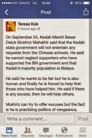kenyataan nenek tua bangsa cinabeng, teresa kok mengenai keengganan mb kedah untuk meluluskan pembinaan baru sekolah cinabeng di  kedah memberikan kita signal penting...