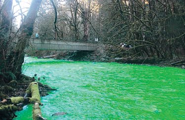 OTTAWA, Kanada - Sungai Goldstream di Kanada yang mengalir melalui bandar Langford di British Columbia bertukar menjadi warna hijau. Seorang jurugambar yang mengembara di tebing sungai tersebut untuk merakamkan gambar burung helang, Tyson Elder sempat merakamkan gambar sungai itu yang berwarna hijau pada 29 Disember lalu. Bahan pewarna hijau itu tidak menyebabkan kematian ikan dan ia bertukar semula kepada warna asal dalam tempoh sejam. Para penyiasat pada mulanya menyalahkan satu bahan organik yang digunakan sebagai pencelup sebagai punca kejadian itu. Namun, semasa kejadian, tiada ujian dilakukan untuk menguji sistem air di kawasan tersebut dengan menggunakan bahan pencelup hijau. Ketua Jabatan Bomba Langford, Bob Beckett menyalahkan golongan nakal yang tidak dikenali melakukan kejadian itu. ![]() ![]()