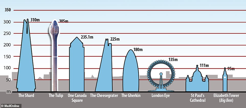 Ia akan mempunyai tingkat atas yang diperbuat daripada kaca bagi memberikan pandang 360 darjah kepada pengunjung. Tarikan utamanya ialah tiga sistem gondola kaca berputar yang pastinya tidak direka untuk insan yang gayat. Ia mensasarkan memulakan pembinaan pada tahun 2020 dan siap pada tahun 2025. Satu masalah yang dihadapi sekarang ia dikatakan terlalu tinggi dan menghalang sistem radar yang digunakan pada lapangan terbang di sekitar London. Menara ini dinamakan menara The Tulip kerana ianya seakan bunga tulip yang direka khas oleh firma Foster + Partners. - CARI |