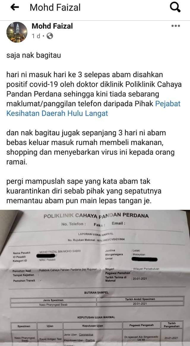 Kecoh di media sosial mengenai seorang pemuda yang disahkan positif Covid-19 tetapi mendakwa dirinya keluar ke tempat awam. Perkara itu dimaklumkan sendiri oleh individu berkenaan di laman Facebook miliknya memaklumkan menerima keputusan kit ujian pantas antigen (RTK-Ag) yang dibuat di sebuah klinik swasta di Ampang, Selangor pada 20 Januari 2021. Sehingga hari ketiga disahkan positif Covid-19, lelaki terbabit mendakwa tiada sebarang maklumat atau panggilan telefon daripada pejabat kesihatan daerah (PKD). "Nak beritahu juga sepanjang tiga hari ni abam bebas keluar masuk rumah membeli makanan, shopping dan menyebarkan virus ini kepada orang ramai," katanya. Pengakuan tersebut membangkitkan kemarahan netizen kerana sifat tidak bertanggungjawabnya terutama negara kini mencatatkan peningkatan kes harian Covid-19. Seorang peguam di laman Facebook berasingan kemudian tampil menjelaskan bahawa dia akan bertindak mewakili rakannya yang digelarnya sebagai Encik F, sekiranya pihak berkuasa menjalankan siasatan susulan kekecohan yang ditimbulkan lelaki itu. Peguam wanita itu berkata, Encik F mengadu mengalami beberapa gejala seperti demam, batuk, sakit tekak, hilang selera makan dan hilang deria bau. Jelasnya, status yang dimuat naik oleh Encik F di Facebook bertarikh 22 Januari 2021 ditulis semata-mata untuk mendapatkan perhatian segera pihak Kementerian Kesihatan Malaysia (KKM). "Netizen kena prank. Saya tidak setuju dengan prank sebegini. Tapi tidak dinafikan, ia telah mewujudkan kesedaran kepada kita semua," katanya. Menurut peguam berkenaan, Encik F berkali-kali menghubungi PKD sejak 20 Januari dan menunggu diambil oleh ambulans untuk dibawa ke mana-mana pusat kuarantin. Ini katanya disebabkan beberapa faktor iaitu rumah sewa Encik F sangat kecil dan tidak sesuai untuk menjalani kuarantin kendiri selain mempunyai lima rakan serumah yang semuanya negatif Covid-19. "Encik F sepanjang masa bersiap sedia untuk dihantar ke mana-mana pusat kuarantin, agar beliau tidak menjangkiti orang lain di sekelilingnya. Malangnya pihak KKM begitu lambat untuk bertindak. "Kerana itulah Encik F 'jentik' KKM melalui status Facebook tersebut. Bagaimana agaknya reaksi semua orang jika menyedari ada manusia yang positif Covid-19 sedang berlegar di sekeliling mereka?" soalnya. Terkini, Encik F menerusi postingnya pada Isnin memaklumkan bahawa PKD Hulu Langat memintanya datang membuat ujian Real-time Polymerase Chain Reaction (rt-PCR) untuk pengesahan Covid-19. "PKD Hulu Langat call suruh datang buat PCR. Tiba hari ni bila abam dah sampai kat tempat PKD ni, yang bertugas ni kata kat sini tak buat PCR, hanya keluarkan surat pelepasan saja," dakwa Encik F bagaimanapun tidak mengetahui apakah surat pelepasan yang dimaksudkan. Setakat berita ini ditulis, usaha mStar untuk mendapatkan komen PKD Hulu Langat berhubung isu tersebut belum berhasil. Sumber: mStar |
