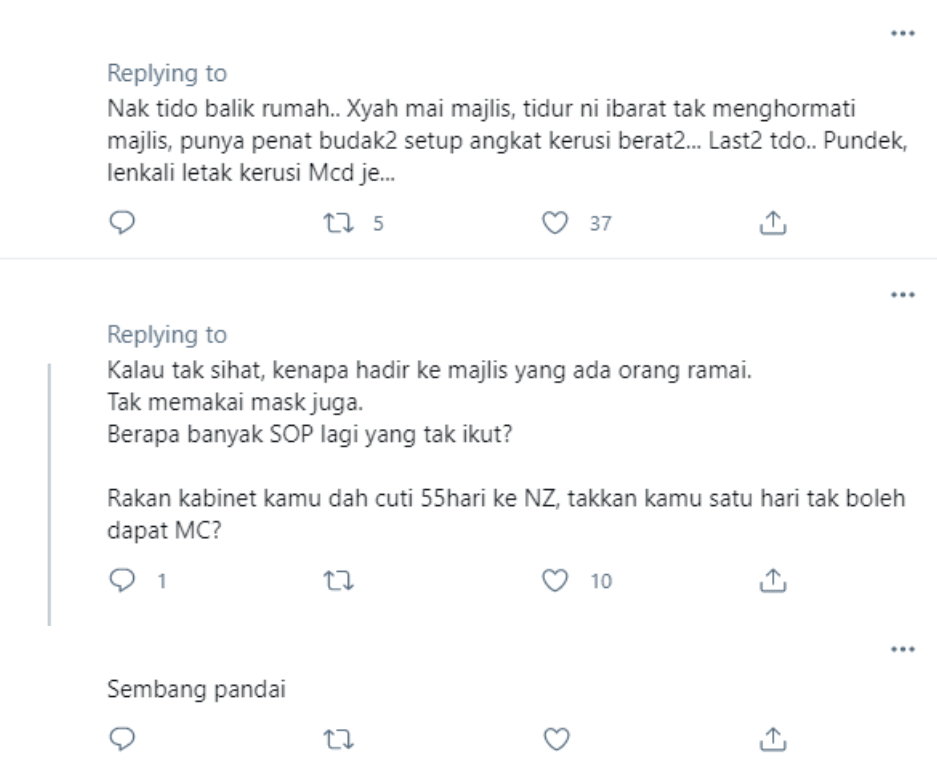 Menerusi rakaman video berdurasi 0:45 minit itu, ahli parlimen berkenaan dipercayai terlena di kerusinya sehingga tidak sedar bahawa namanya sudah dipanggil pengacara majlis bagi menyempurnakan program dan kelihatan tiga individu cuba mengejutkannya dari tidur. Berikutan kejadian itu, Malaysiakini melaporkan bahawa ahli parlimen tersebut memberi penjelasan serta membuat permohonan maaf mengenai insiden berkenaan. ![]() Kredit foto: Twitter Eddin Syazlee via Facebook Najib Razak Menurut Pegawai Tugas Khas Timbalan Menteri Kerja Raya iaitu Farahiah Zubir, Datuk Eddin berada dalam keadaan kurang sihat, namun beliau tetap hadir ke majlis berkenaan bagi memenuhi undangan jemputan. Mencegah lebih baik dari mengubati. - CARI |