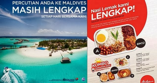 Perkhidmatan penerbangan Air Asia hari ini menarik perhatian orang ramai apabila mengiklankan promosi 'Nasi Lemak Kami Lengkap! Macam ini baru betul' di akhbar Berita Harian. Melalui muka surat kedua akhbar itu, promosi itu turut menyenaraikan kandungan lengkap hidangan nasi lemak Pak Nasser iaitu kacang, ikan bilis dan rendang ayam. Tindakan mengiklankan 'Nasi Lemak Pak Nasser' oleh Air Asia dilihat berkait rapat dengan teguran chef selebriti terkemuka Malaysia, Chef Wan terhadap mutu perkhidmatan Malaysia Airlines (MAS) yang menghidangkan apa yang didakwanya sebagai 'nasi lemak teIanjang'. ![]() Dalam pada itu pihak MAS mengeluarkan kembali iklan yang turut berbaur sindirian keatas AIR ASIA berkenaan dengan percutian ke Maldives, yang baru-baru ini pihak Air Asia telah menghentikan perkhidmatan penerbangan ke tempat tersebut.