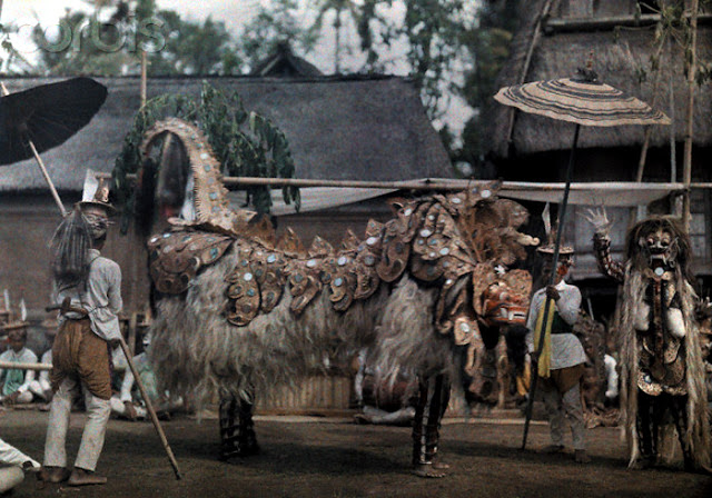 .jpg) | | 1928, Bali, Indonesia --- Balinese priests dressed in costume for their sacred lion dance --- Image by © Franklin Price Knott/National Geographic Society/Corbis |