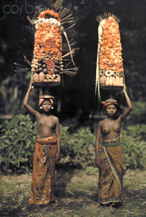 .jpg) | | Bali, Indonesia --- Two Balinese women carry temple offerings of fruit on their head --- Image by © Franklin Price Knott/National Geographic Society/Corbis |
